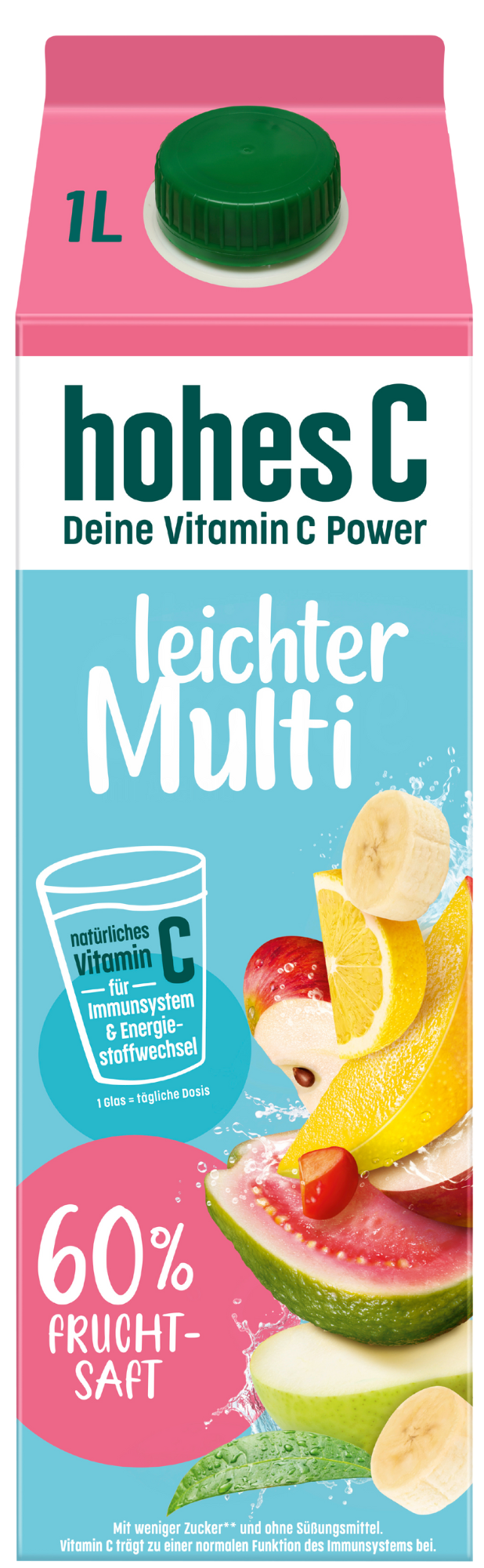 Dein Glas für den Tag: Mit unserem hohes C leichter Multi erhältst du 60% Fruchtsaft in bester hohes C Qualität - also nicht nur leicht sondern auch lecker. Schon gewusst? Bereits ein Glas hohes C leichter Multi (0,25 L) deckt den Tagesbedarf an Vitamin C - und zwar mit natürlichem Vitamin C aus der Acerola. Vitamin C trägt zu einer normalen Funktion des Immunsystems und zu einem normalen Energiestoffwechsel bei. Eine ausgewogene Ernährung und gesunde Lebensweise werden empfohlen.