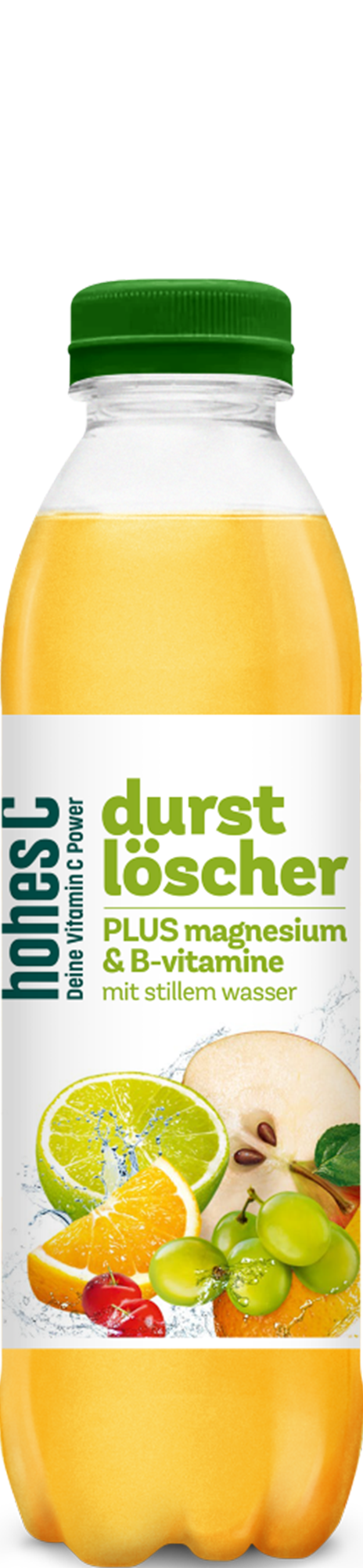 Die hohes C Durstlöscher Range bietet eine köstliche Erfrischung für unterwegs in 3 fruchtigen Sorten. Klein aber oho: in einer Flasche Durstlöscher (0,5l) steckt nicht nur ein maximaler Frischekick, sondern auch ein ganzer Tagesbedarf an Vitamin C. Darüber hinaus bietet jede der 3 Sorten noch weitere Gesundheits-Benefits.