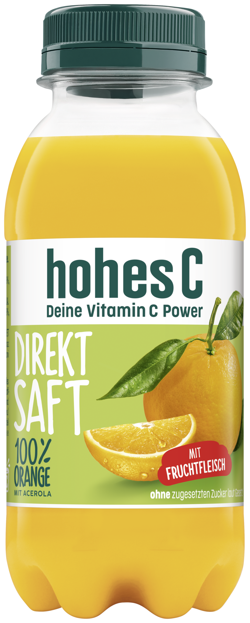 Schon gewusst? Bereits ein Glas hohes C Direksaft Orange mit Fruchtfleisch (0,25 L) deckt den Tagesbedarf an Vitamin C - und zwar mit natürlichem Vitamin C aus der Acerola. Vitamin C trägt zu einer normalen Funktion des Immunsystems und zu einem normalen Energiestoffwechsel bei. Eine ausgewogene Ernährung und gesunde Lebensweise werden empfohlen.